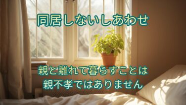 距離をおく 同居しないしあわせ——親と離れて暮らすことは、親不孝ではありません 50代になると、親との同居について向き合わなければならない場面が増えてきます。親も高齢になり、片方が亡くなったあとの一人暮らしへの不安、健康面や経済的な心配……。正直気は進まないけど「一緒に住んだほうがいいのではないか」と悩まれている方も多... 2026.04.05 距離をおく